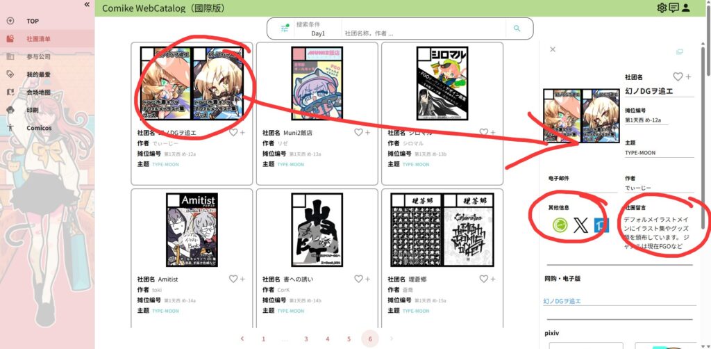 选择后会显示该主题的所有摊位,可以先大致浏览一下,并点击摊位图看看你比较顺眼的。右侧可以获取社团的自我介绍以及绑定的社交平台账号(如推特)。下图为举例。